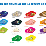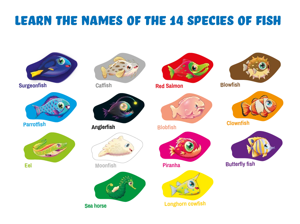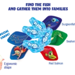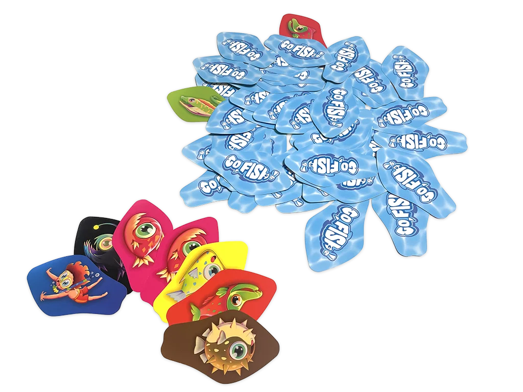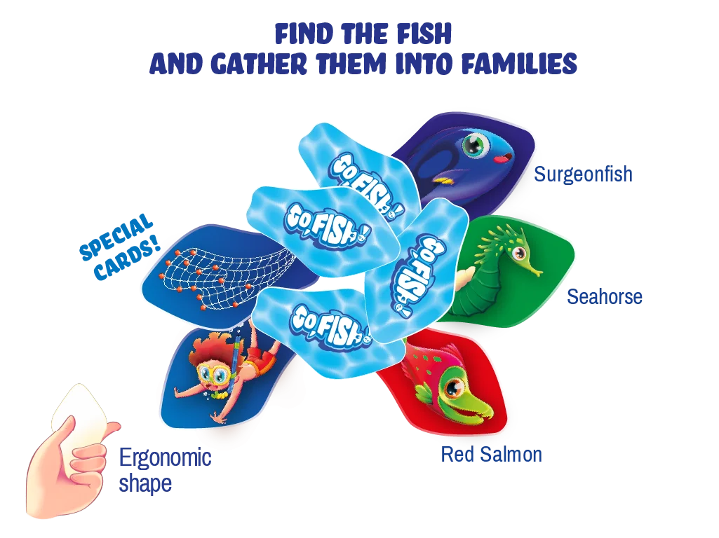 3. Players ask others for specific fish cards by name, color, or showing a card. If unsuccessful, draw from the lake. Play continues until all cards form families or the lake is empty.