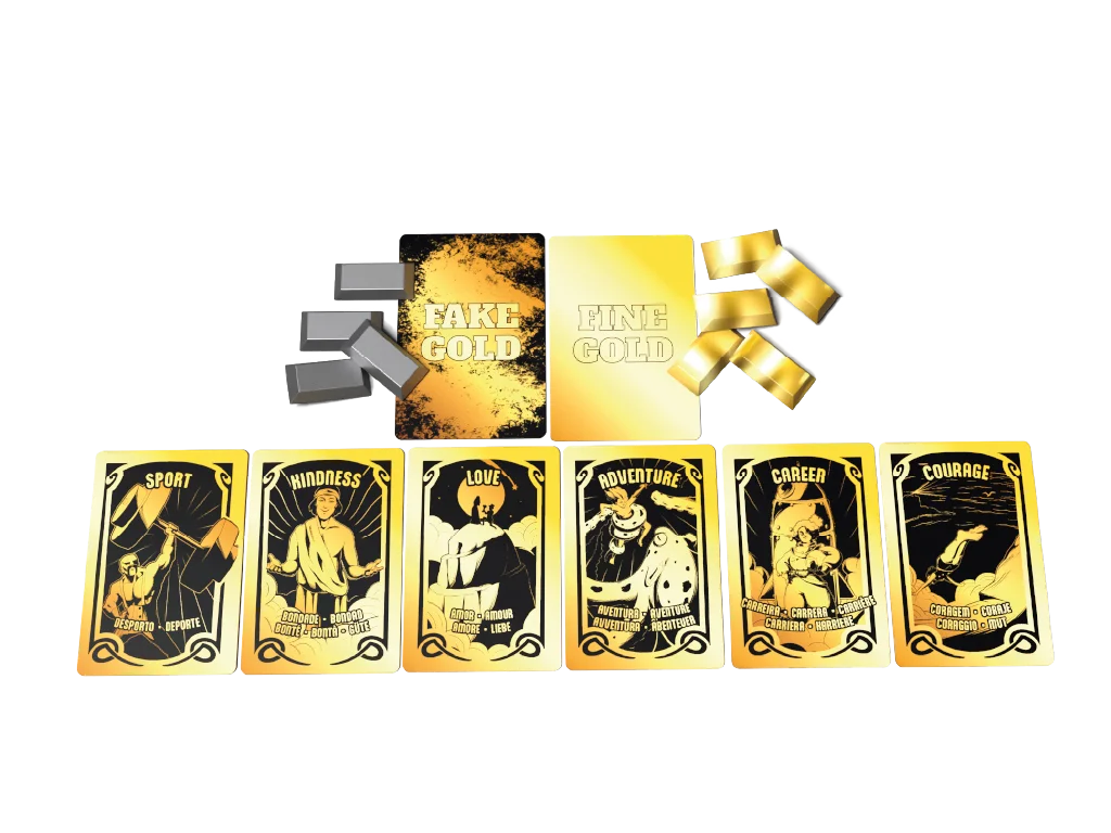 Each player gets nugget cards to bet and 1 Fine Gold/ Fake Gold card.