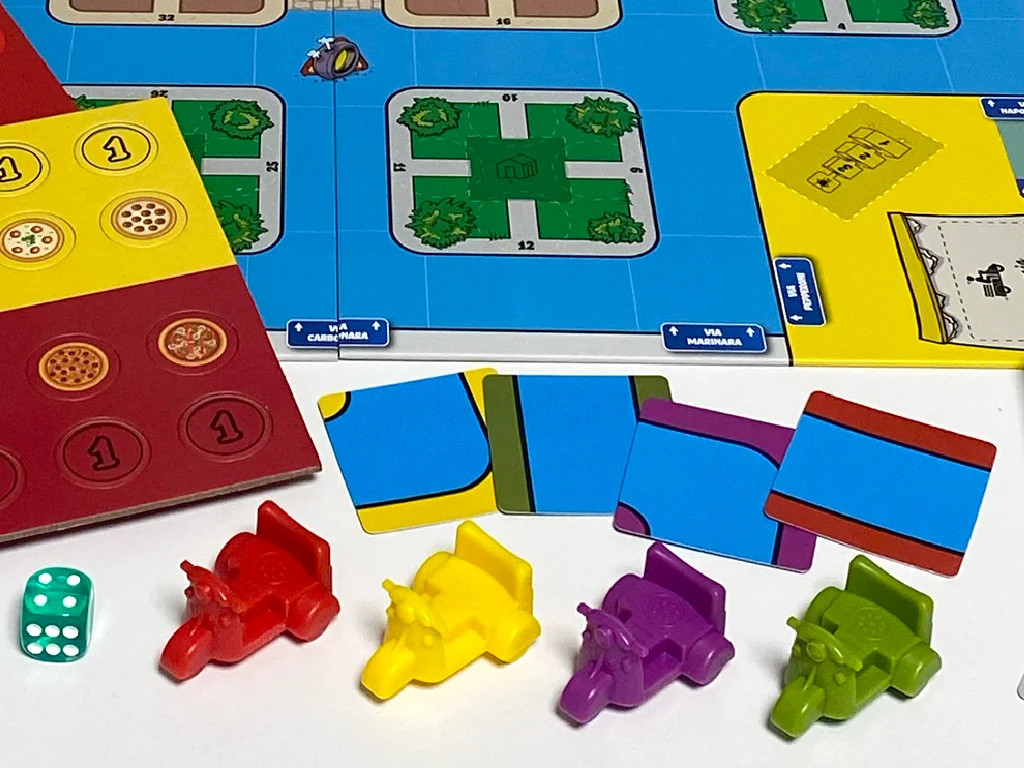 1. Each player picks a pizzeria, scooter, 3 pizzas, 3 coins, and crossroads cards.